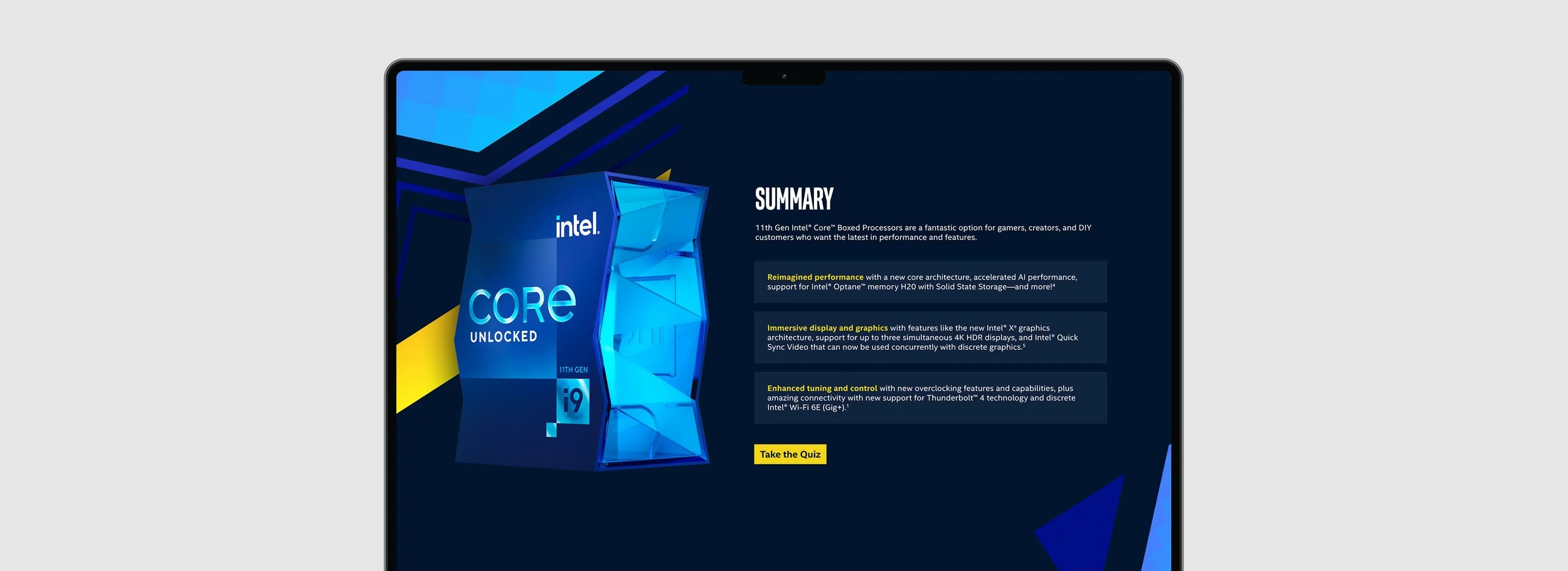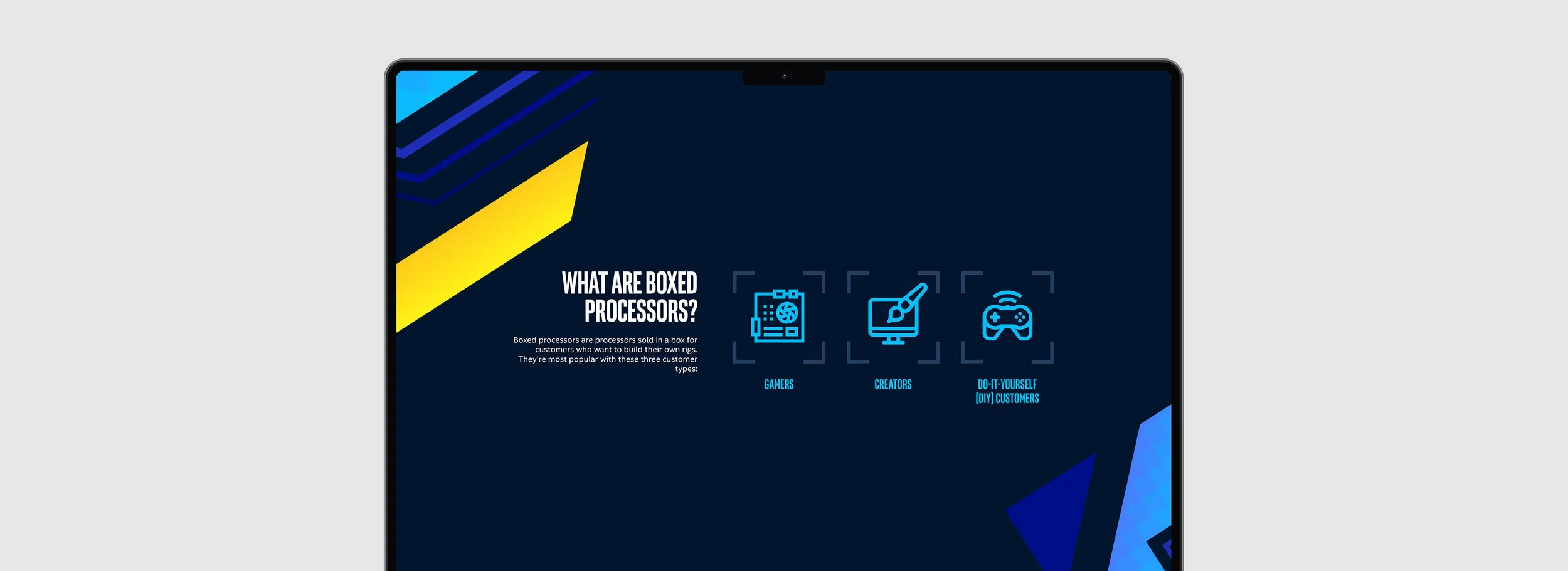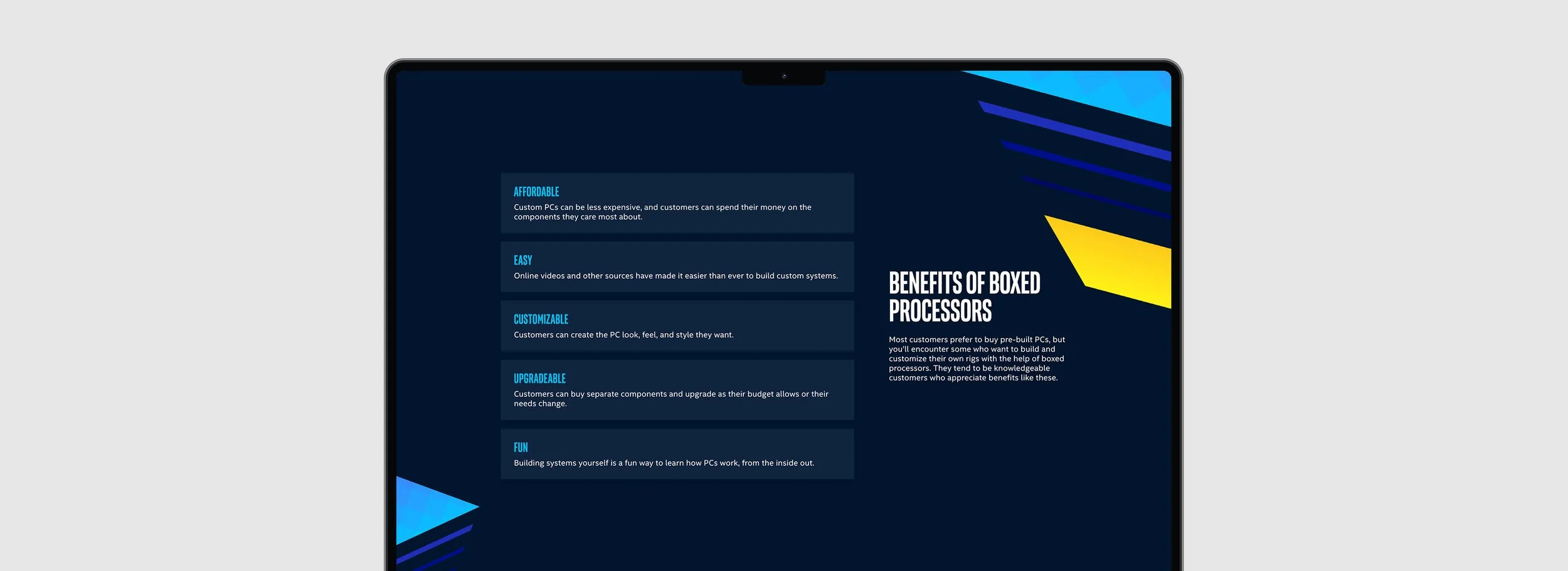 The Intel Boxed Processors is an interactive website designed to educate sales associates on the main features of the Intel Boxed Processors.