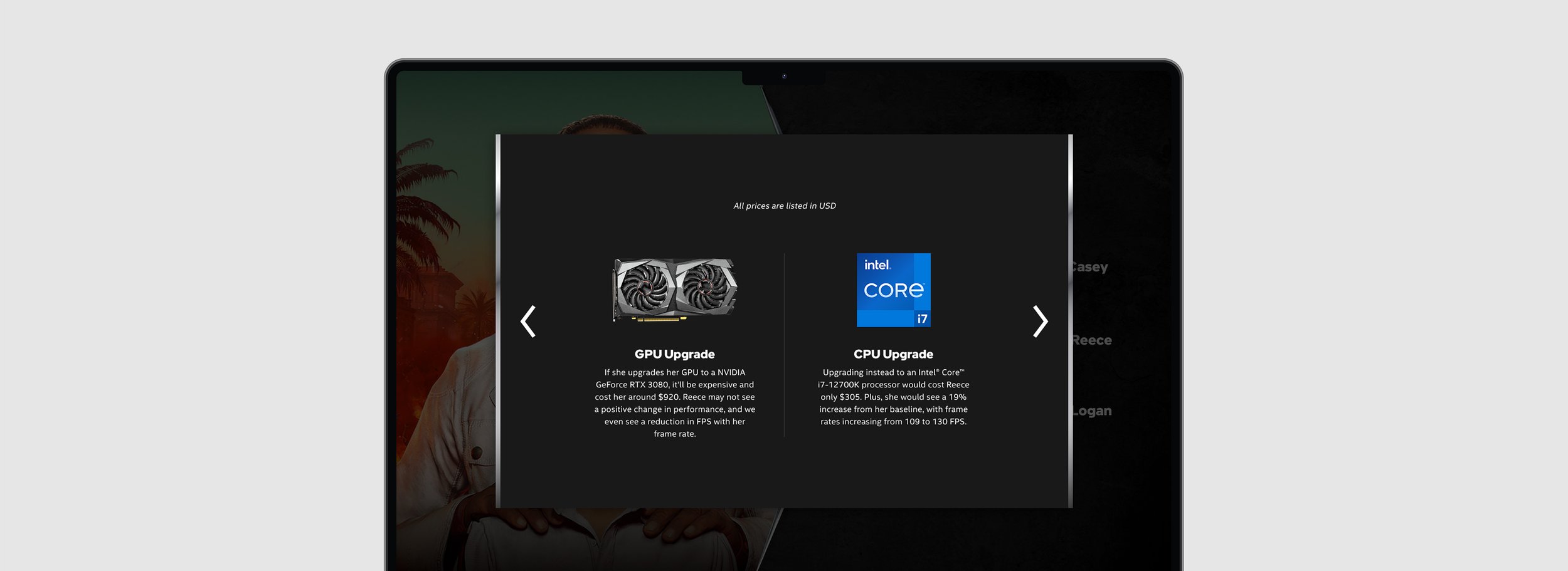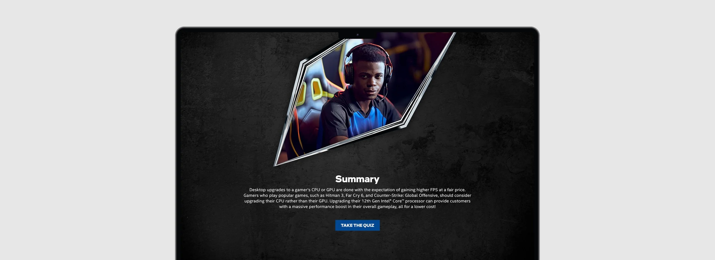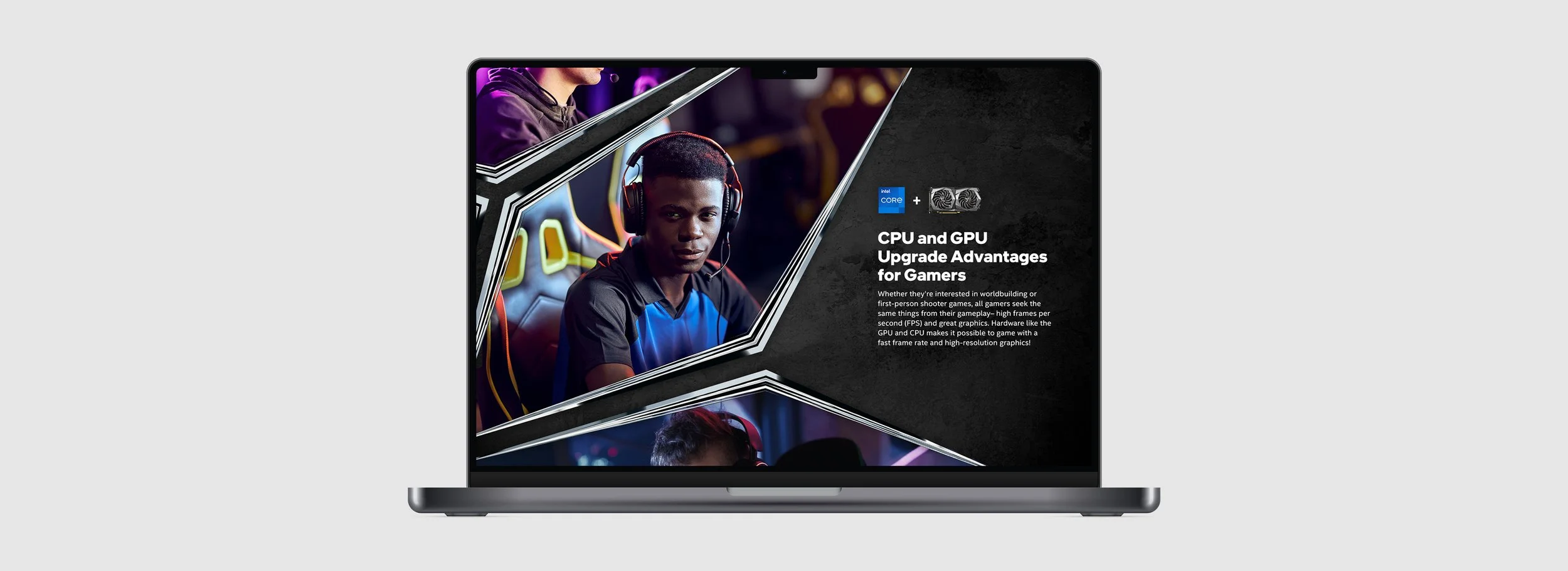 An interactive website designed to educate sales associates on the CPU and GPU advantages of Intel powered computers geared towards gamers.