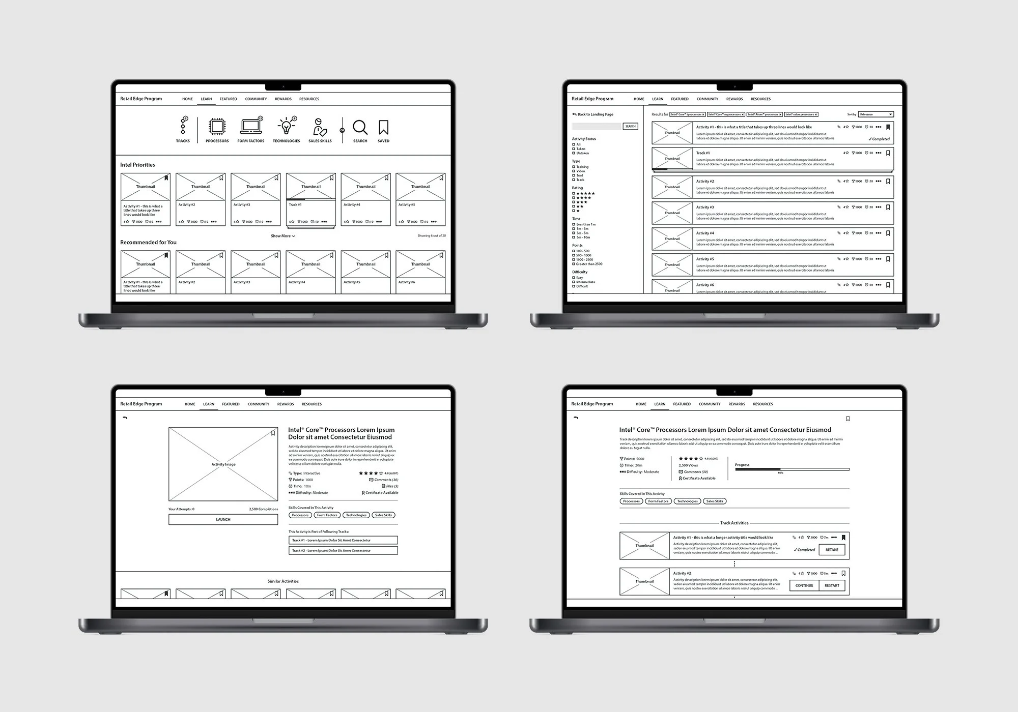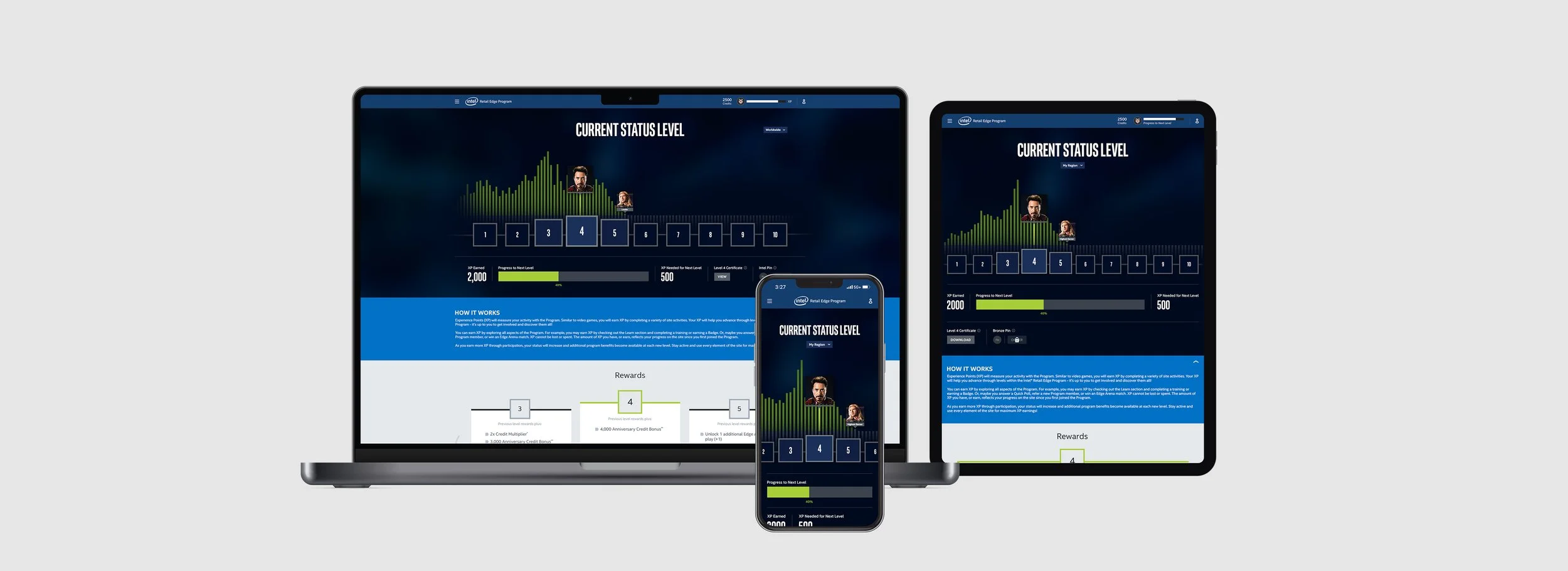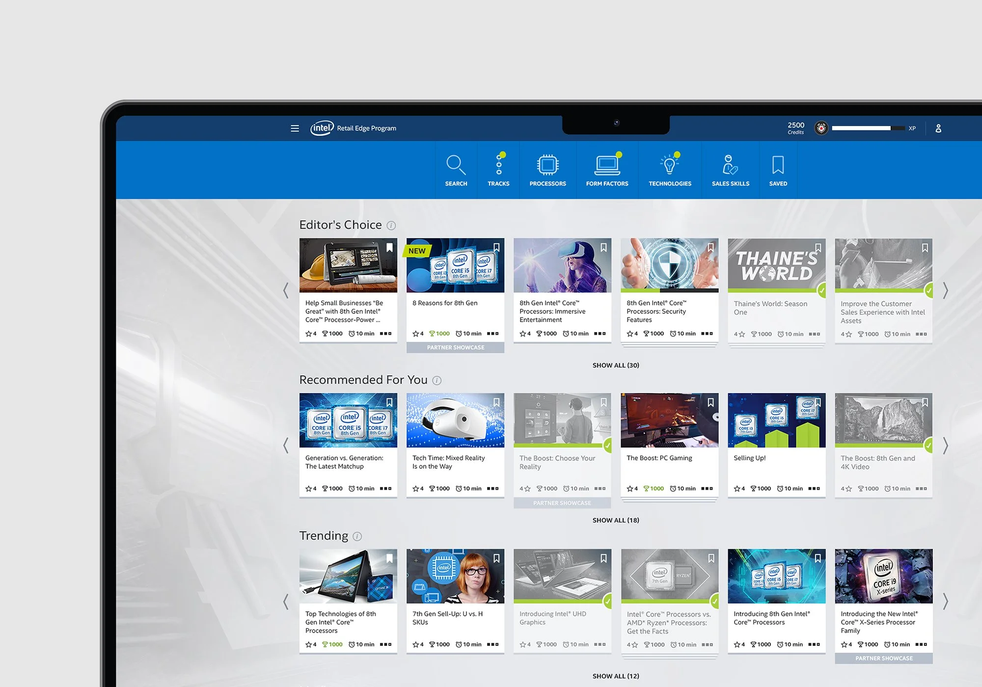 The Intel Retail Edge Program website drives PC sales and employee engagement by training retail associates on Intel products and technologies. I was brought in to asses how the user experience could be improved and to redesign the whole website. The website is fully responsive which means I designed three break points for each page.