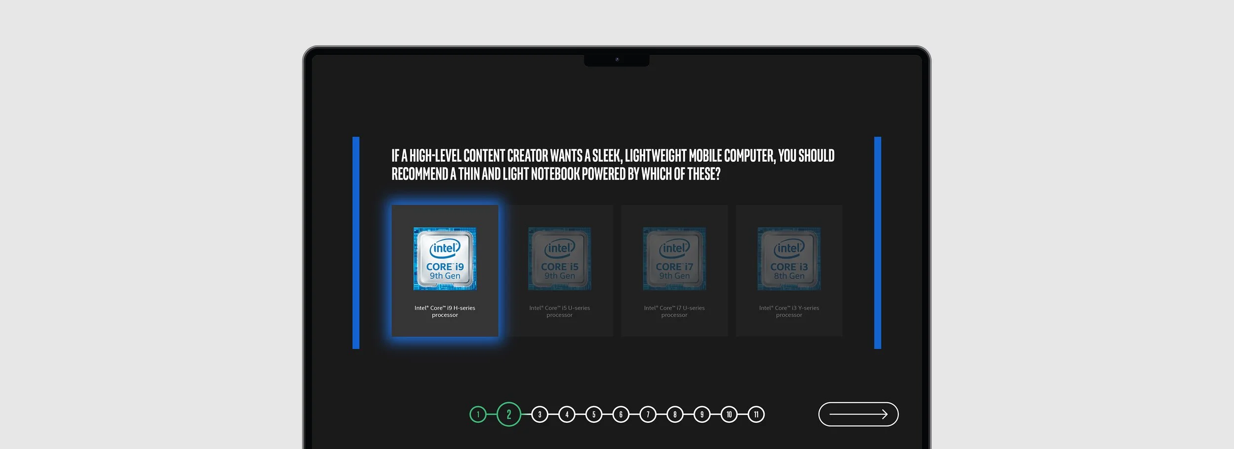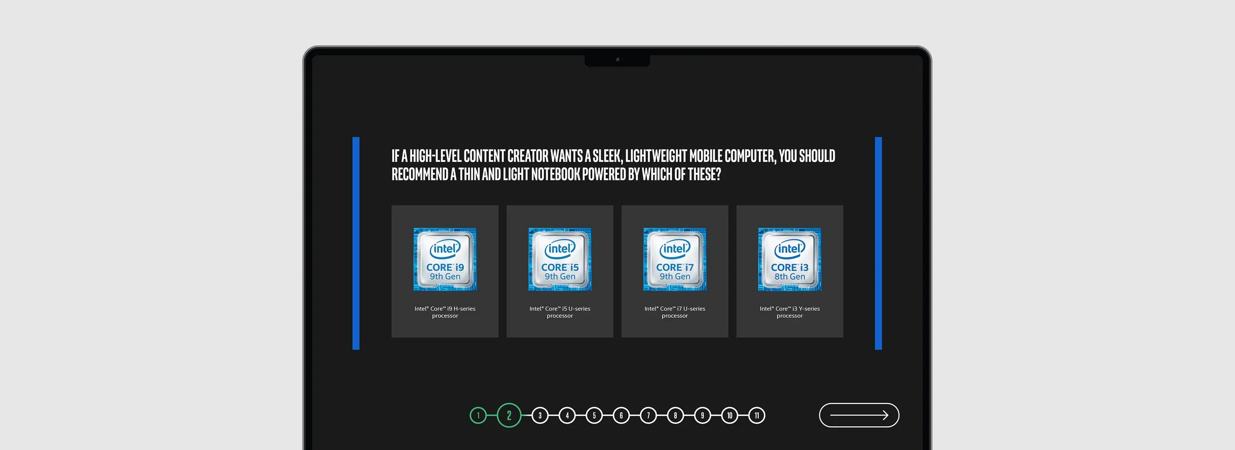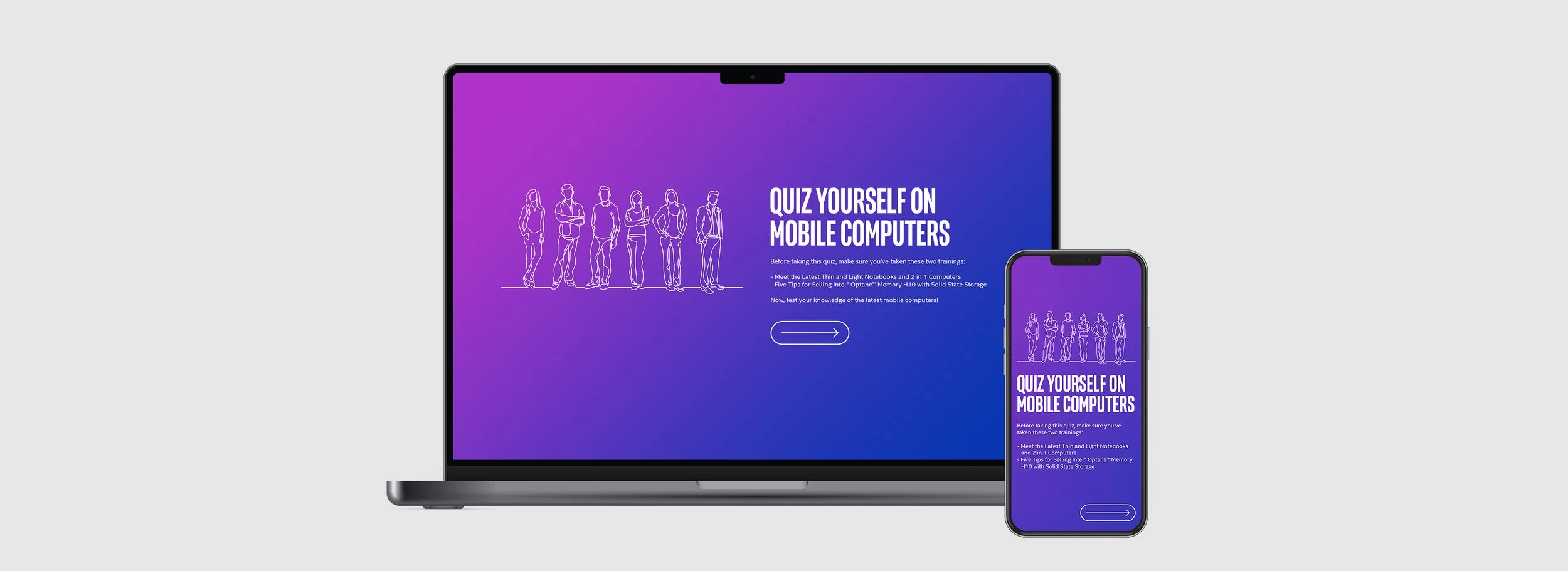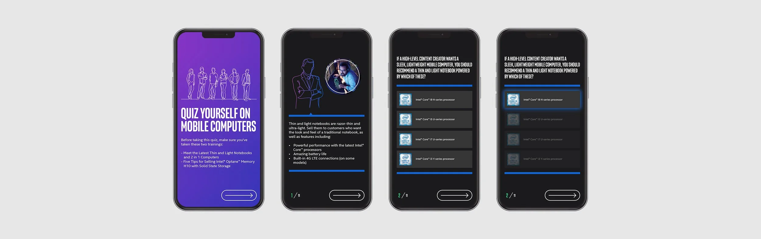 The Intel SWIC Quiz is a series of interactive websites designed to test associates’ knowledge of Intel Core products. I was tasked with coming up with a new visual look that was fresh yet complimentary to the existing Intel materials. I accomplished the task by incorporating Intel fonts, colors, and lifestyle photography into a bolder and more contemporary style.