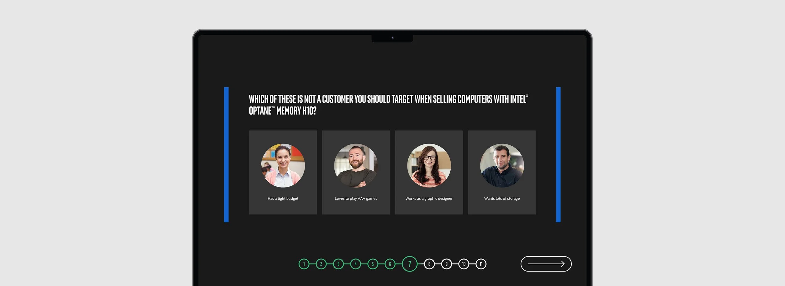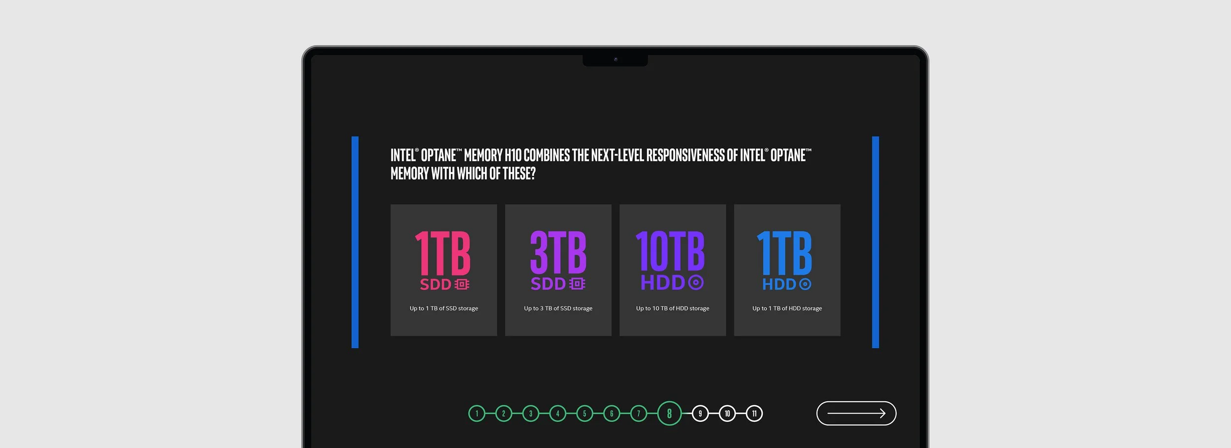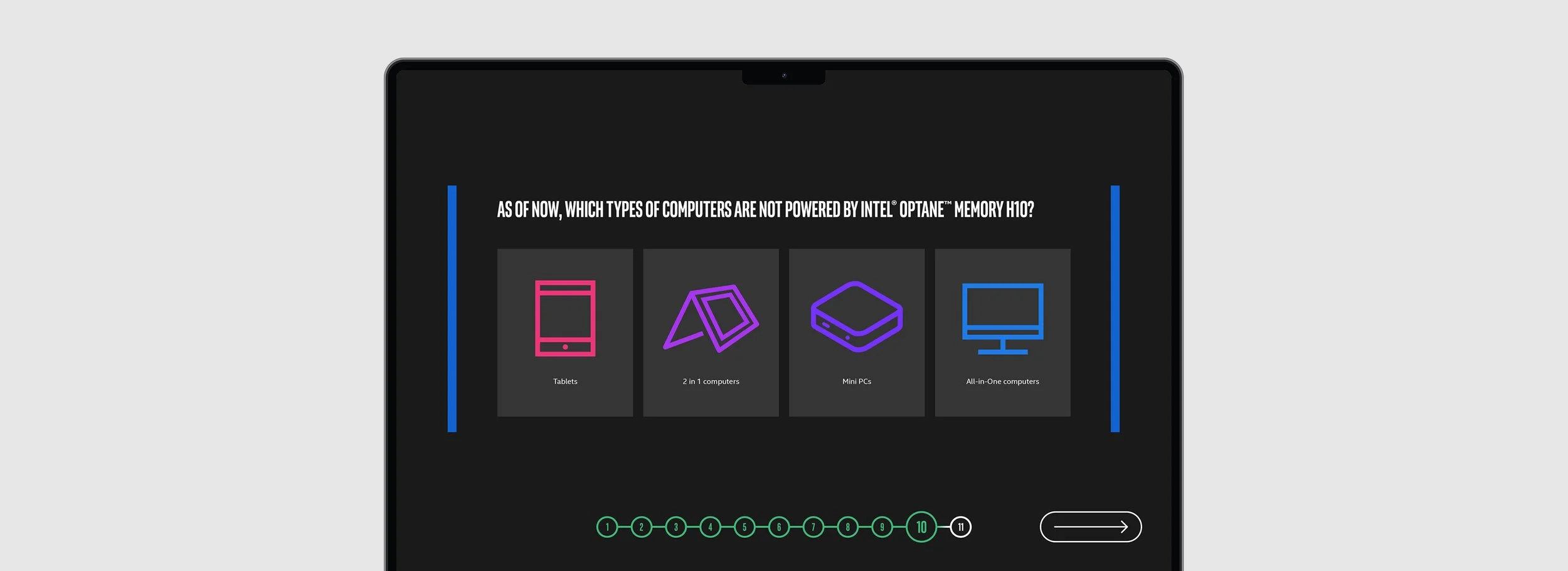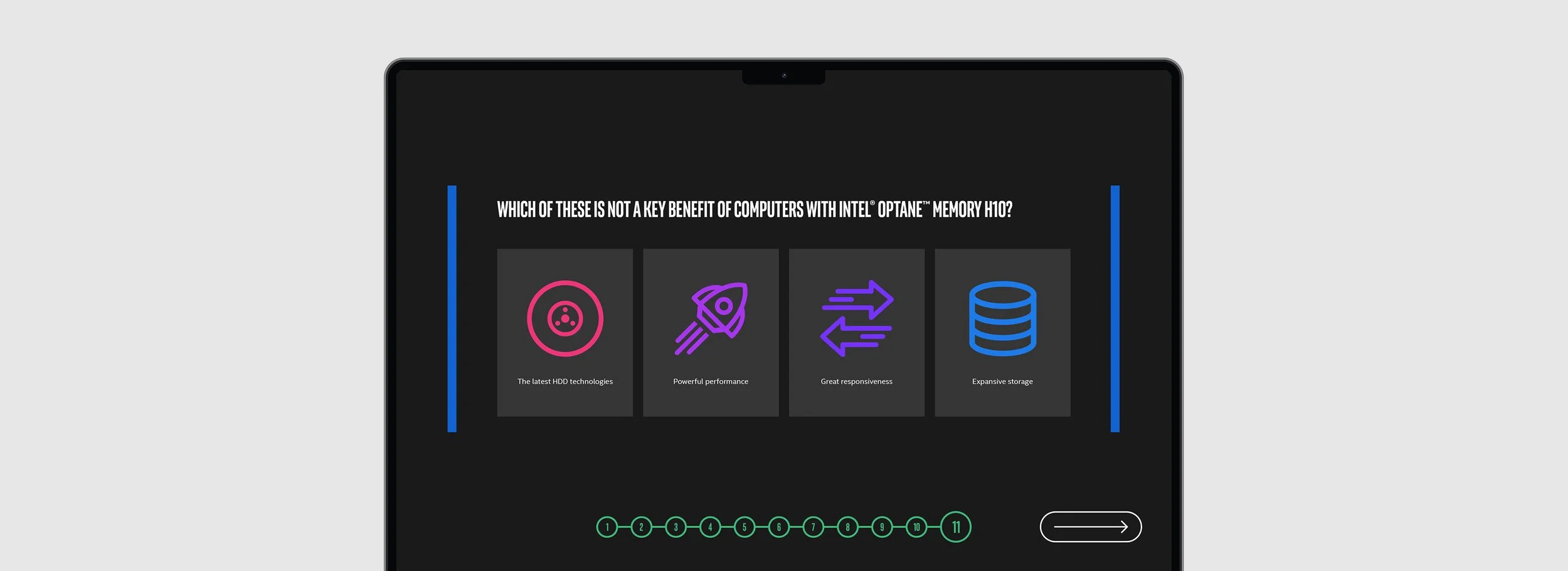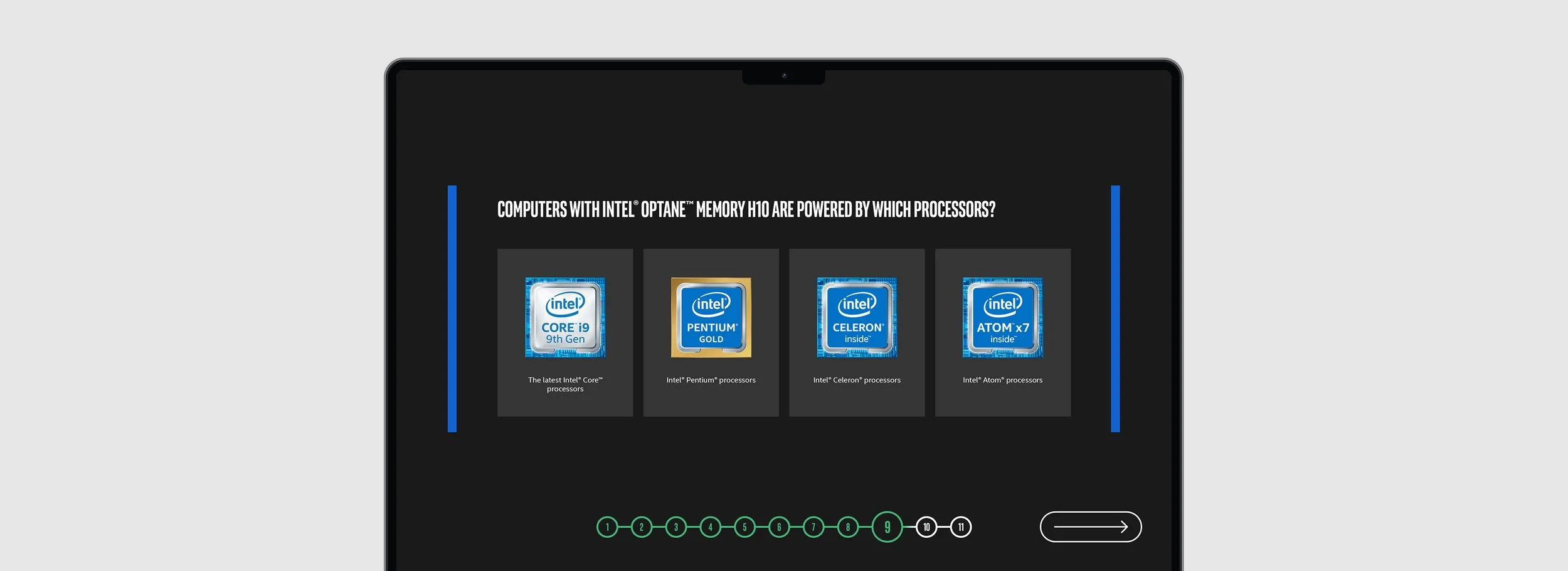 The Intel SWIC Quiz is a series of interactive websites designed to test associates’ knowledge of Intel Core products. I was tasked with coming up with a new visual look that was fresh yet complimentary to the existing Intel materials. I accomplished the task by incorporating Intel fonts, colors, and lifestyle photography into a bolder and more contemporary style.