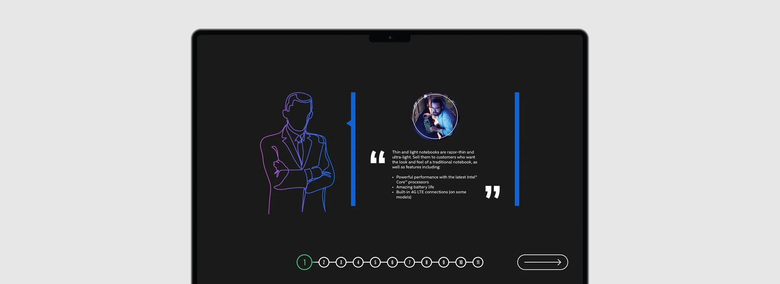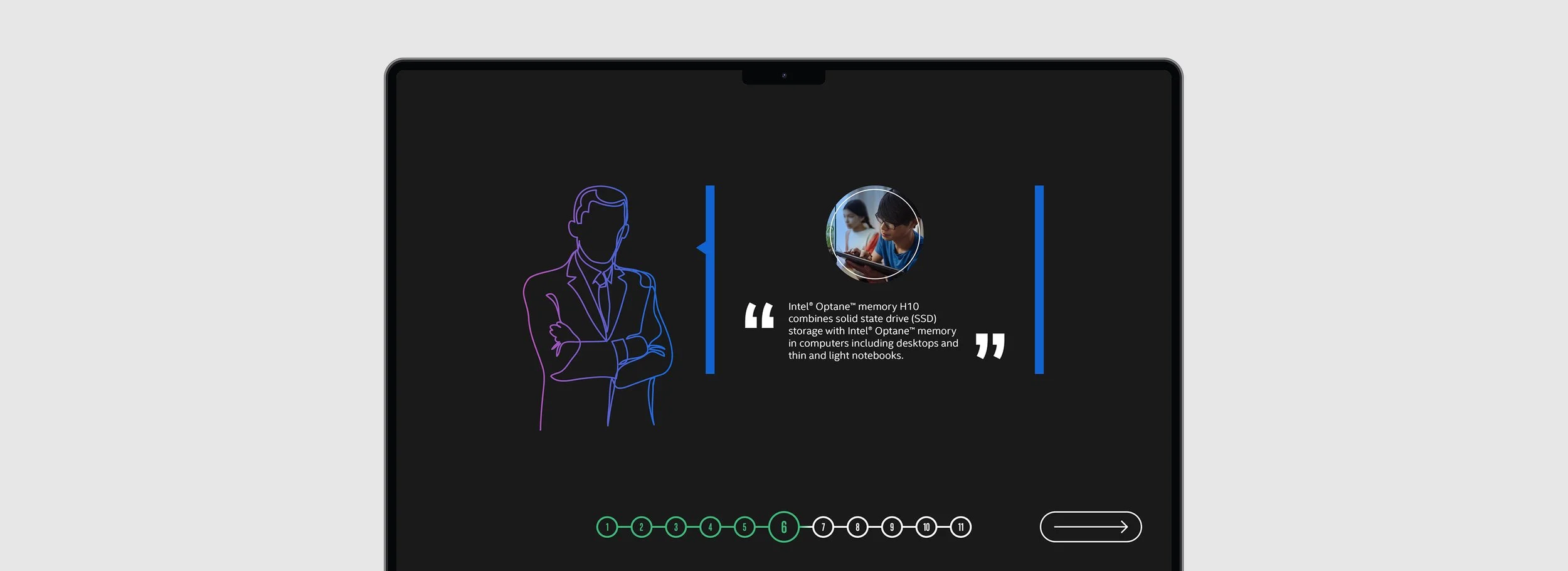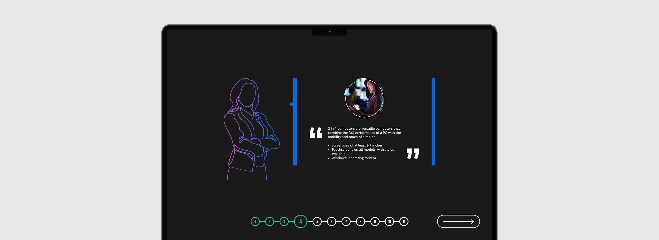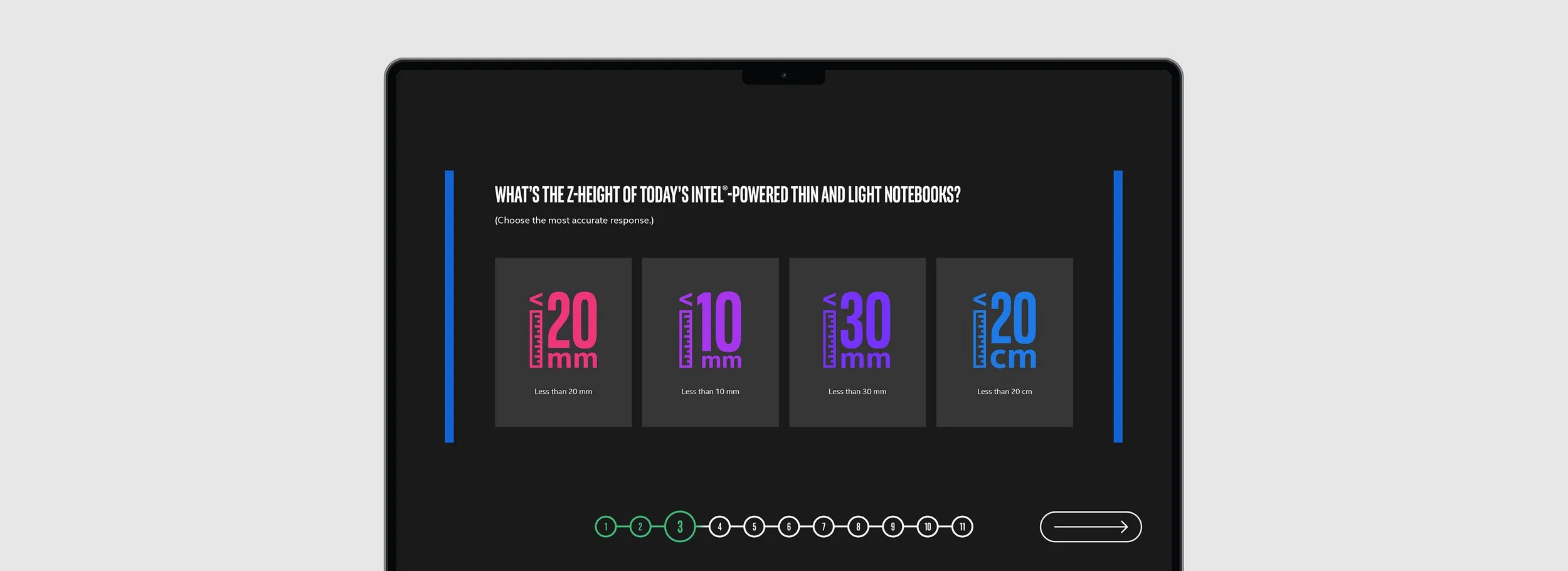 The Intel SWIC Quiz is a series of interactive websites designed to test associates’ knowledge of Intel Core products. I was tasked with coming up with a new visual look that was fresh yet complimentary to the existing Intel materials. I accomplished the task by incorporating Intel fonts, colors, and lifestyle photography into a bolder and more contemporary style.