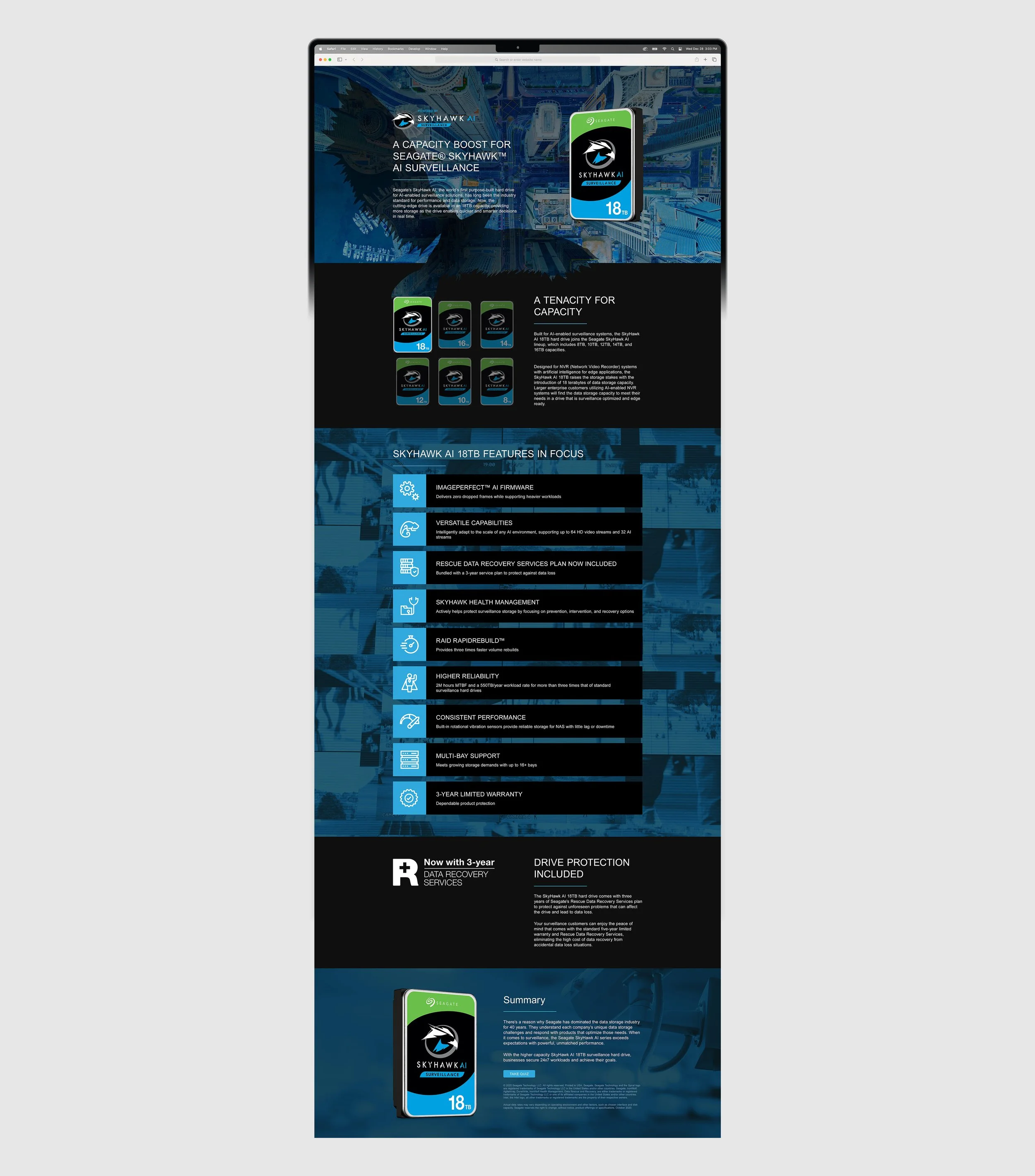 The Seagate SkyHawk AI microsite is designed to educate sales associates on the main features of the SkyHawk AI hard drives.